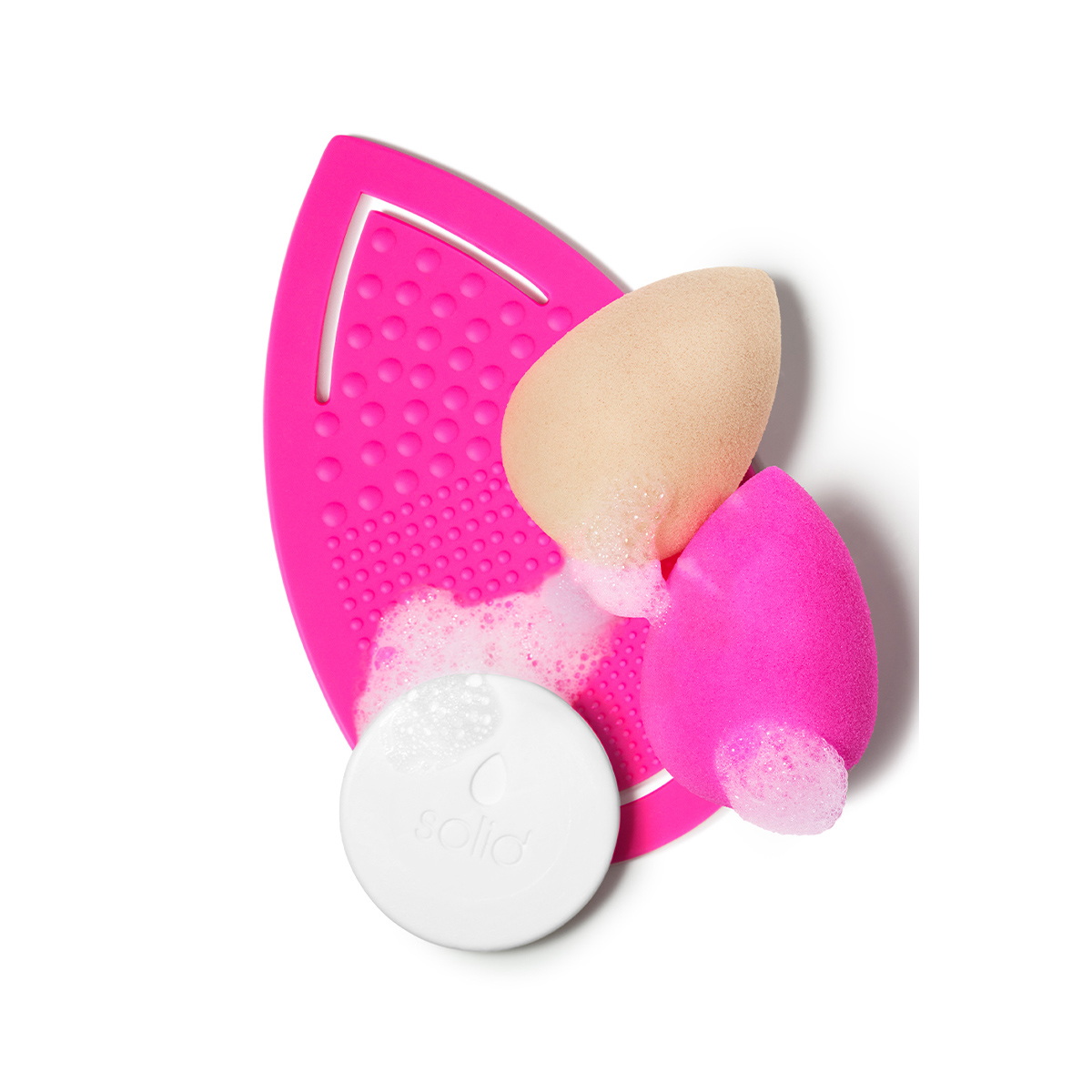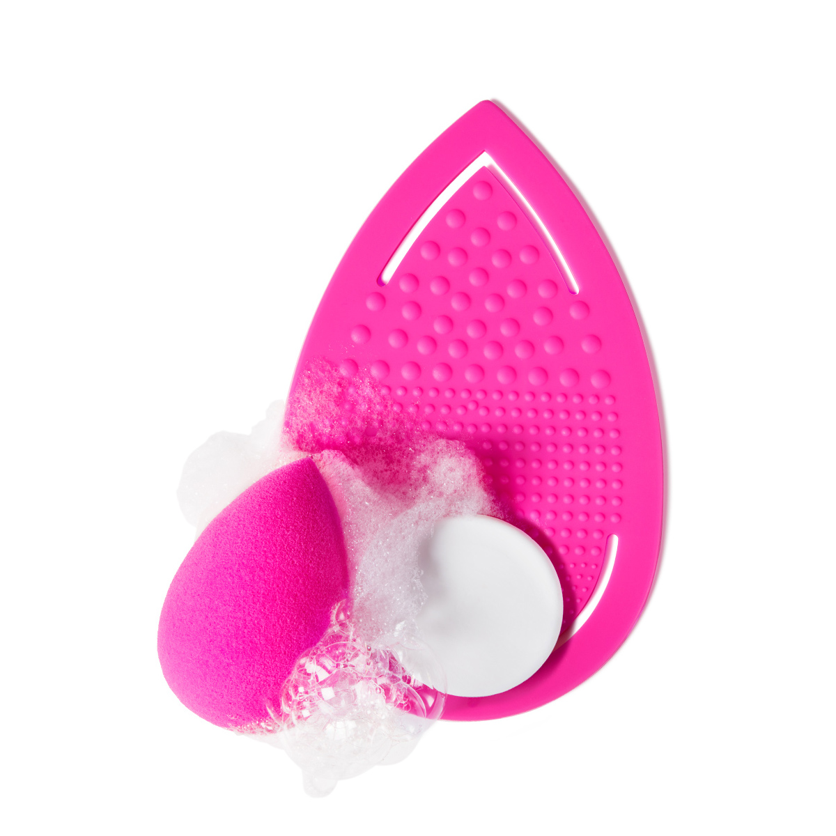 Розовая текстурированная рукавица beautyblender keep.it.clean позволяет очистить спонжи или кисти прямо на ладони. Комплект включает в себя мини-мыло и мини-упаковку геля blendercleanser®, что позволяет выбрать любимый способ очищения.